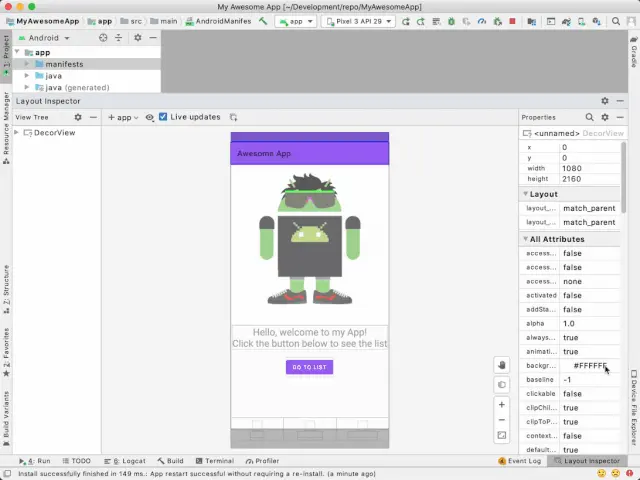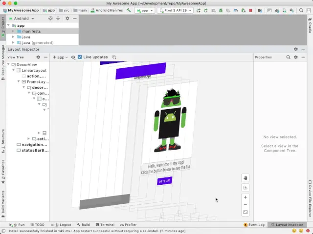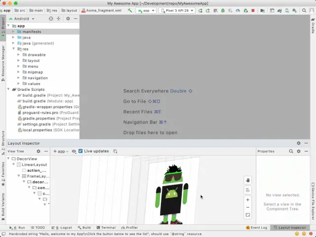 现在大家已经了解了布局检查器的使用方式。那么接下来我们通过实例来看一下如何使用它来解决应用的问题。这里我们有一个简单的示例应用,它包含一个 fragment,其中有一些静态文本和一个图片。如果您在阅读文章时想同步进行操作,可以先按照下面步骤操作创建工程。