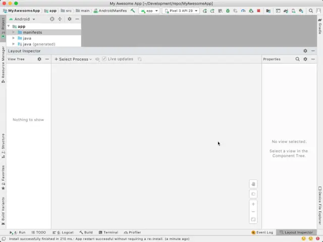 接下来我们一起了解一下最新版本的布局检查器是如何发挥作用的。首先点击窗口的 View 菜单,找到 Tool Window 子菜单,然后选择 Layout Inspector,这样就打开了布局检查器窗口。