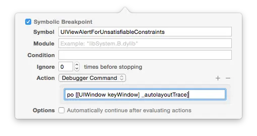 在UIViewAlertForUnsatisfiableConstraints 添加symbolic breakpoint : 1.打开断点导航(cmd+7 )2.点击左下角的+ 按钮3.选择Add Symbolic Breakpoint 4.在Symbol 添加UIViewAlertForUnsatisfiableConstraints