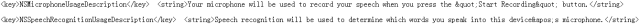 NSMicrophoneUsageDescription-为获取麦克风语音输入授权的自定义消息。注意此语音输入授权仅只会在用户点击麦克风按钮时发生。