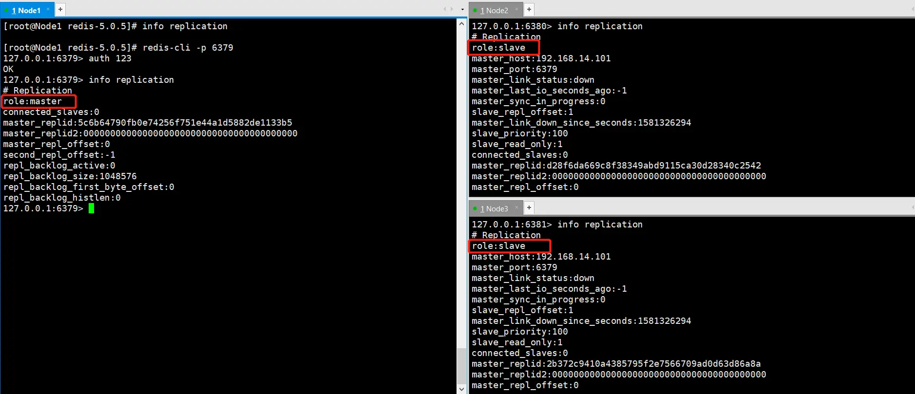 配置完成后,我们通过 redis-server redis.conf 命令启动Redis.然后通过 redis-cli -p 端口 分别进入到各台服务器的控制行页面: