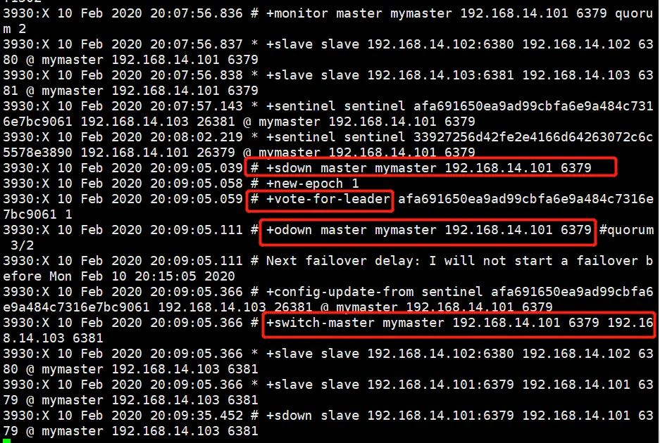 结合我们第4点搭建主从模式,验证主从切换时,kill掉Redis主节点,然后查看 sentinel 日志,如下: