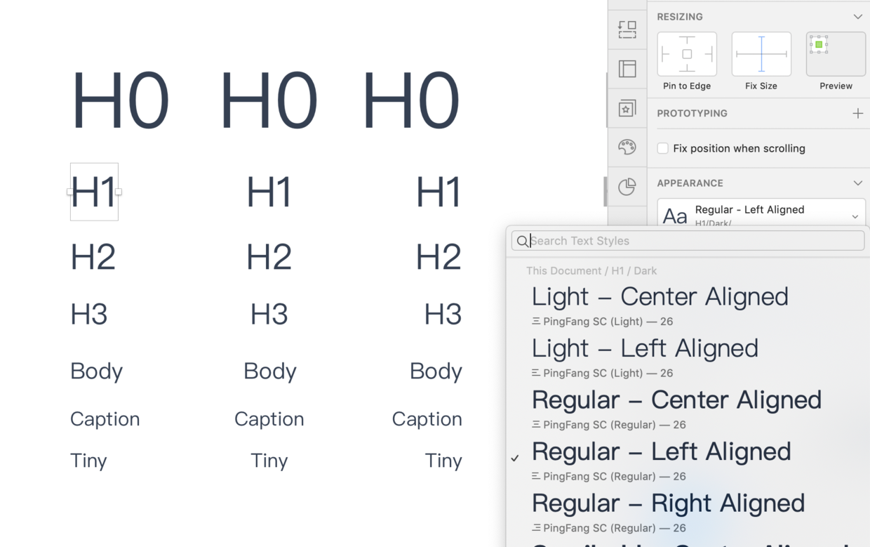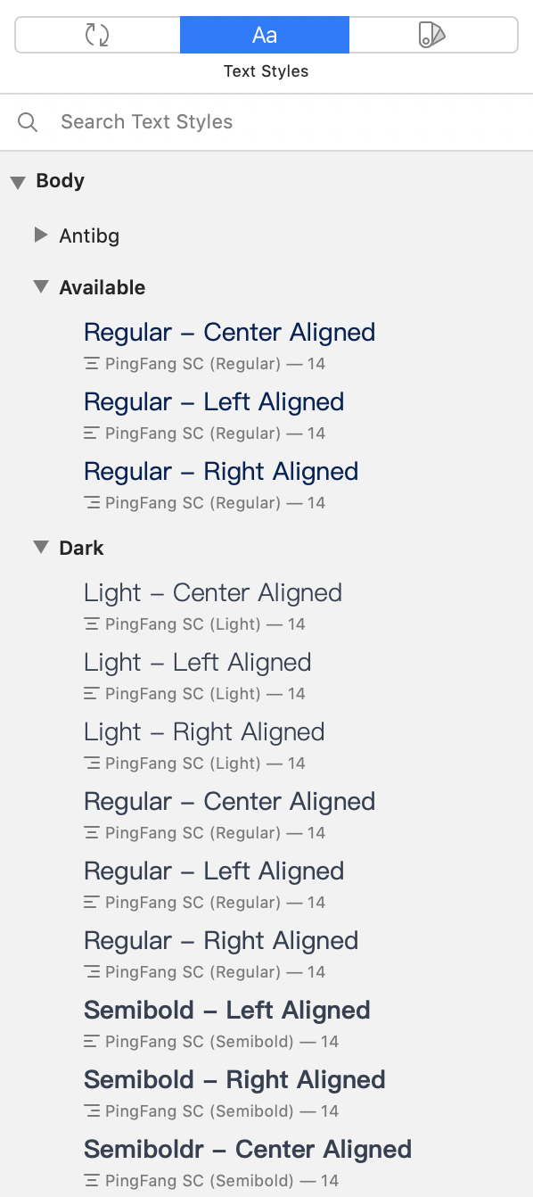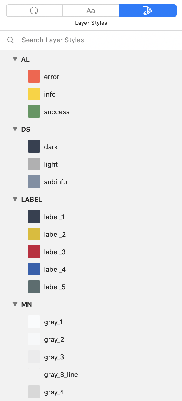 sketch的symbol功能很好的为原子化提供了实践可能性。在sketch文件中将最小颗粒度“原子(如颜色)”按照其使用意图作为名称进行命名;颗粒度再复杂一级的“分子(如字体)”变量名则由typeface/weight/color/size的组合排列产生。