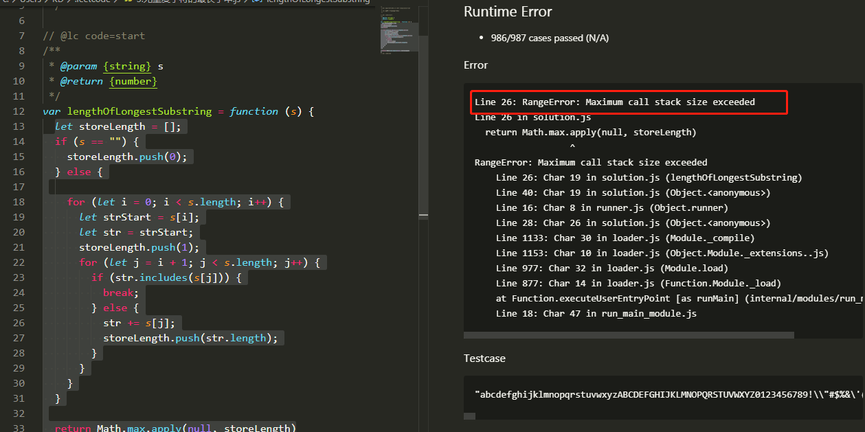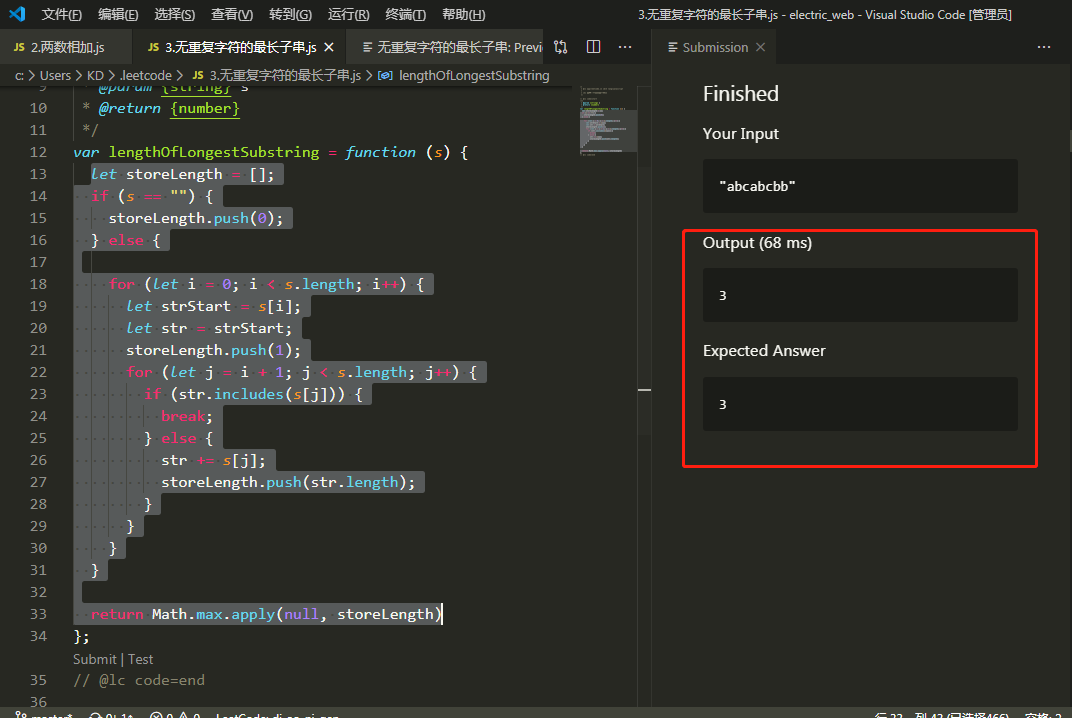 var lengthOfLongestSubstring = function (s) { let storeLength = []; if (s == "") { storeLength.push(0); } else { for (let i = 0; i < s.length; i++) { let strStart = s[i]; let str = strStart; storeLength.push(1); for (let j = i + 1; j < s.length; j++) { if (str.includes(s[j])) { break; } else { str += s[j]; storeLength.push(str.length); } } } } return Math.max.apply(null, storeLength)};点击test测试时候 , 得到了预期的结果