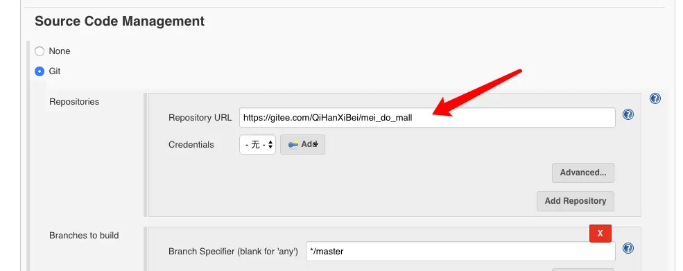 然后新建一个项目,在源代码控制那一栏,输入你的项目的线上git仓库地址,注意默认应该是master分支,因为生产环境部署的代码必须是主分支