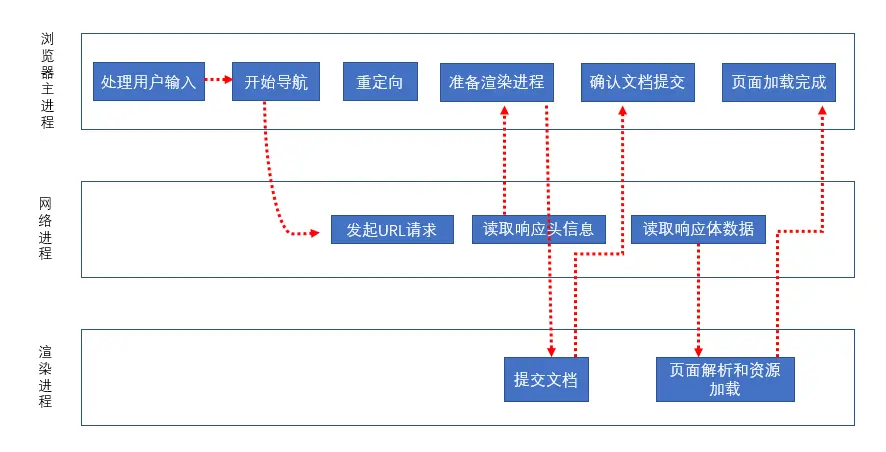 接下来,便进入了页面资源请求过程。这时,浏览器进程会通过进程间通信(IPC)把 URL 请求发送至网络进程,网络进程接收到 URL 请求后,会在这里发起真正的 URL 请求流程。