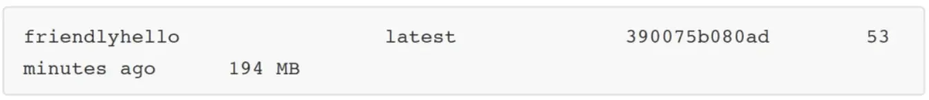 为举例需要,我参考 Docker 官方文档创建了一个名为 friendlyhello 的 Docker 镜像,该镜像大小为 194MB(如下所示):