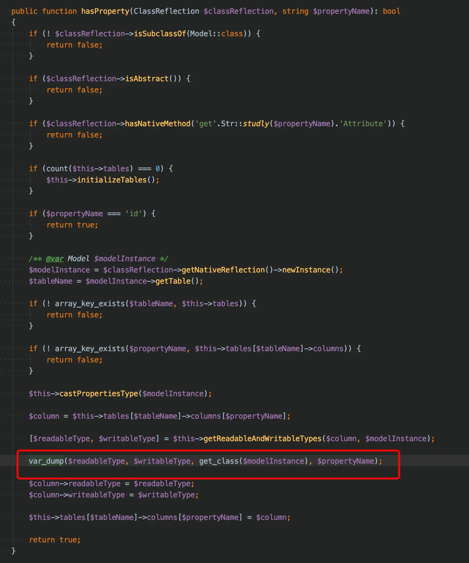 首先分析一下 ModelPropertyExtension 这个类的结构,可以发现只有 hasProperty() 和 getProperty() 两个公共方法。hasProperty 会扫描项目的 migrations 文件来构建各个表各个字段的数据库类型,并判断参数中传入的模型所对应的表是否存在对应的字段,顺带根据数据库字段类型、模型的 Casts 属性分析了这个字段的读(readableType)、写(writableType)类型并保存下来;而 getProperty 就更简单了,直接返回了 hasProperty 推导出的字段类型。