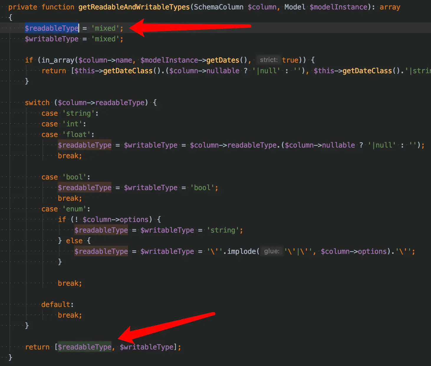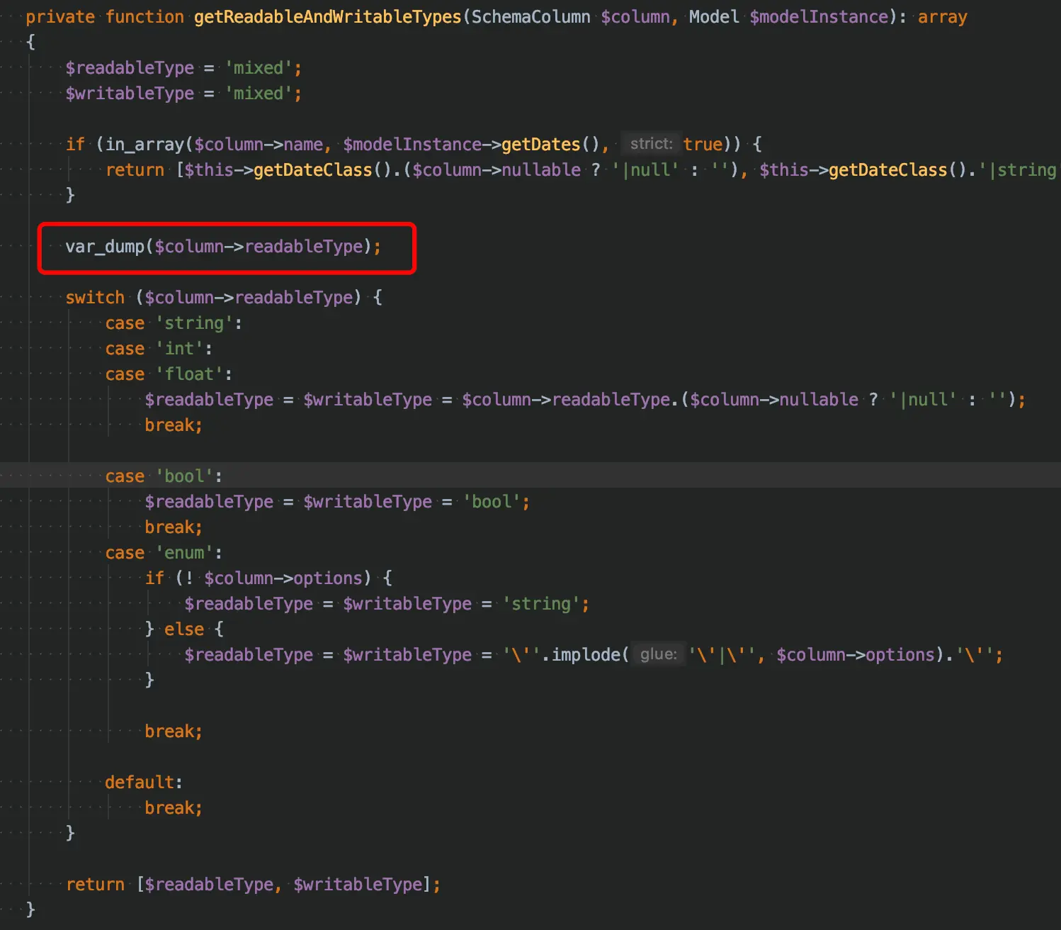 可以看到 $readableType 变量被初始化成 mixed,然后根据 $column->readableType 的值去做对应的调整。
