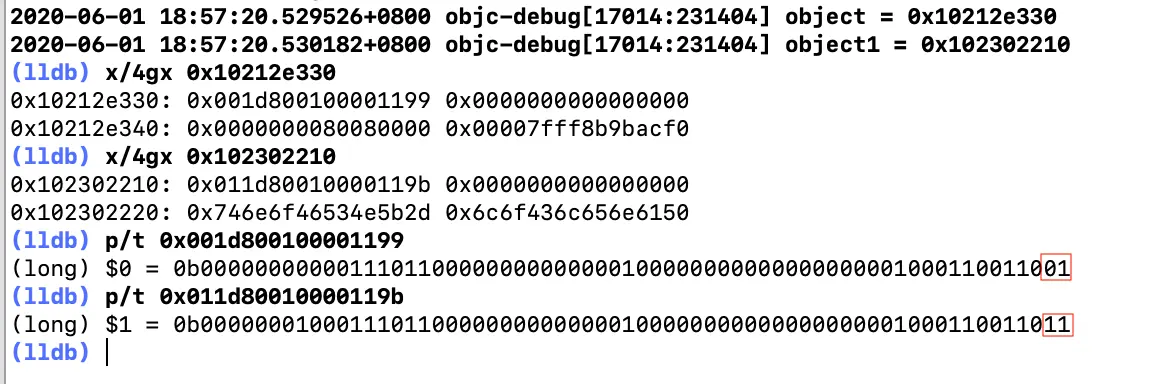 NSLog(@"object1 = %p", object1);用lldb打印出它们各自的isa内容