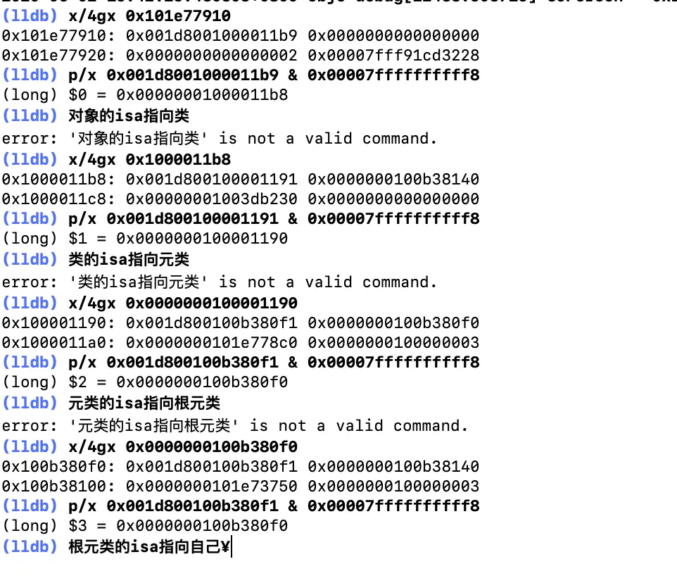 因为isa是对象中的第一个元素,所以x/4gx打印出来的第一个地址就是isa,在用isa&isa_mask就得到isa的指向,依次类推