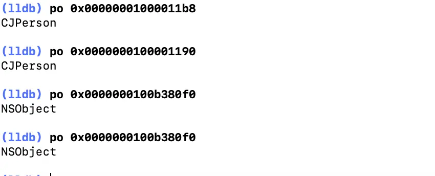 举个例子验证下,用上面CJPerson实例出来的对象lldb打印下isa的走位