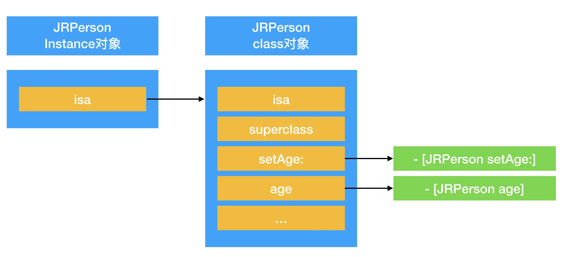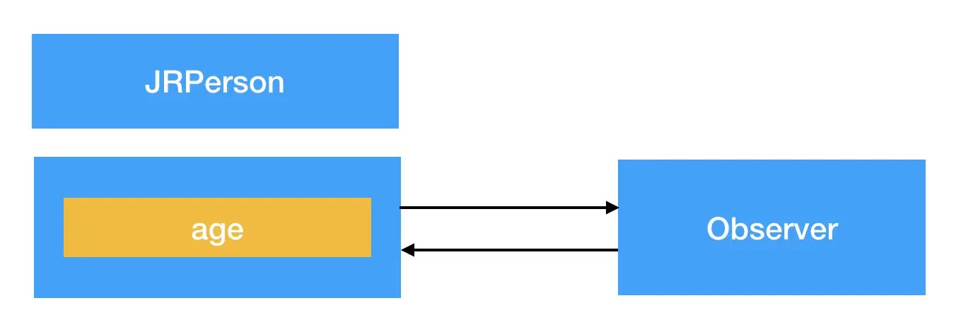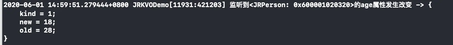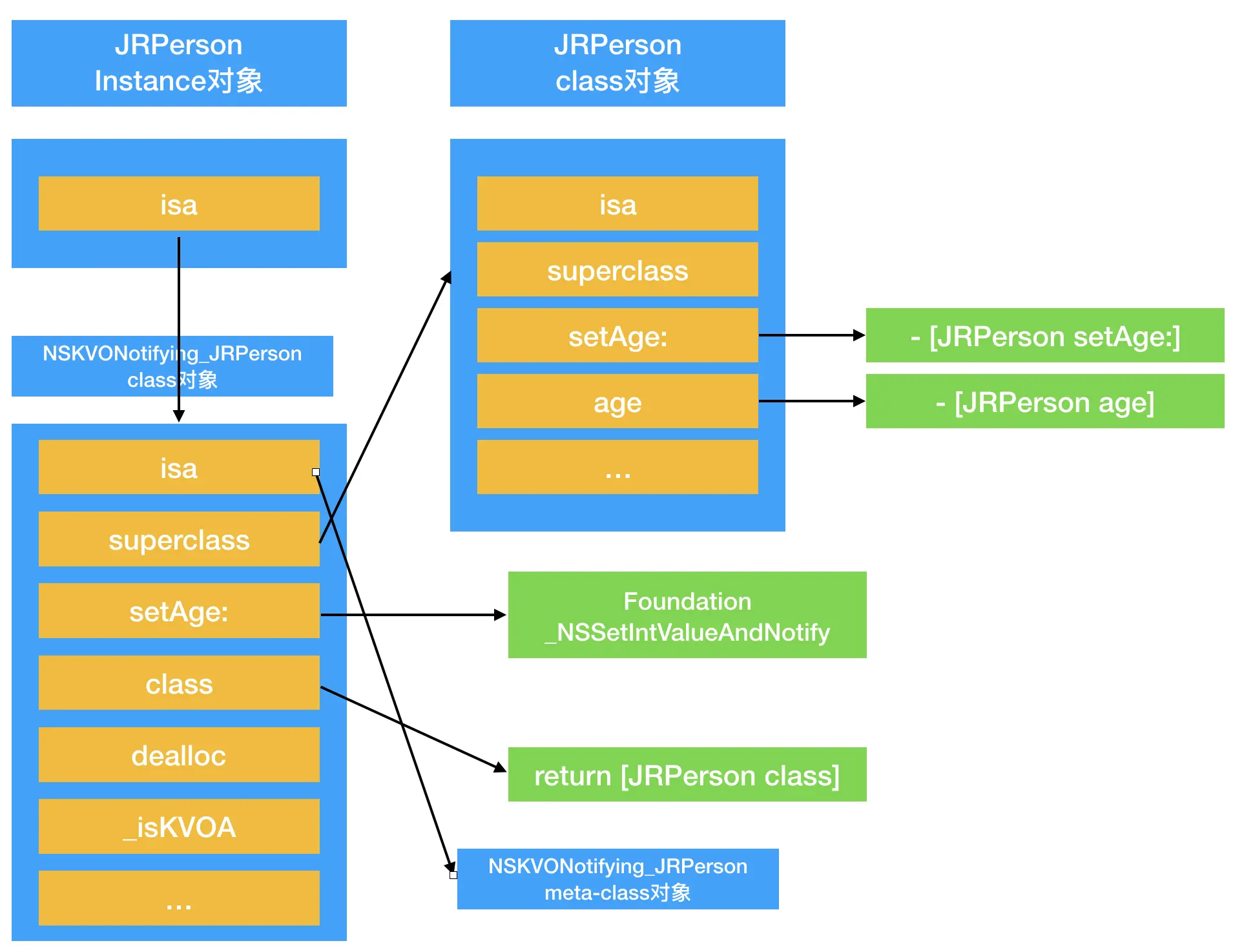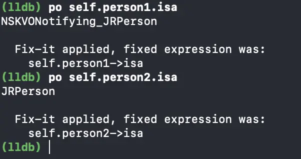 通过在self.person添加对age属性的监听(addObserve)之前打印该对象所属的类【objc_getClass(self.person1)】,和添加监听之后打印该对象所属的类,我们发现,在添加监听之前,self.person1所属JRPerson类,添加监听之后,self.person1所属NSKVONotifying_JRPerson类。