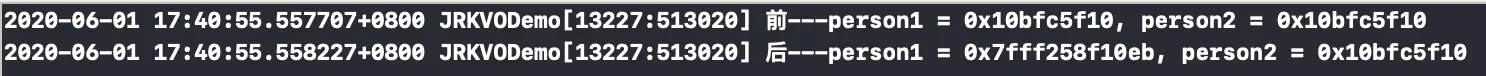 同理,我们在添加监听的前后,打印person1和person2的setAge:方法的实现地址值,可以看出,person1前后的地址值不同,person2前后的地址值相同。