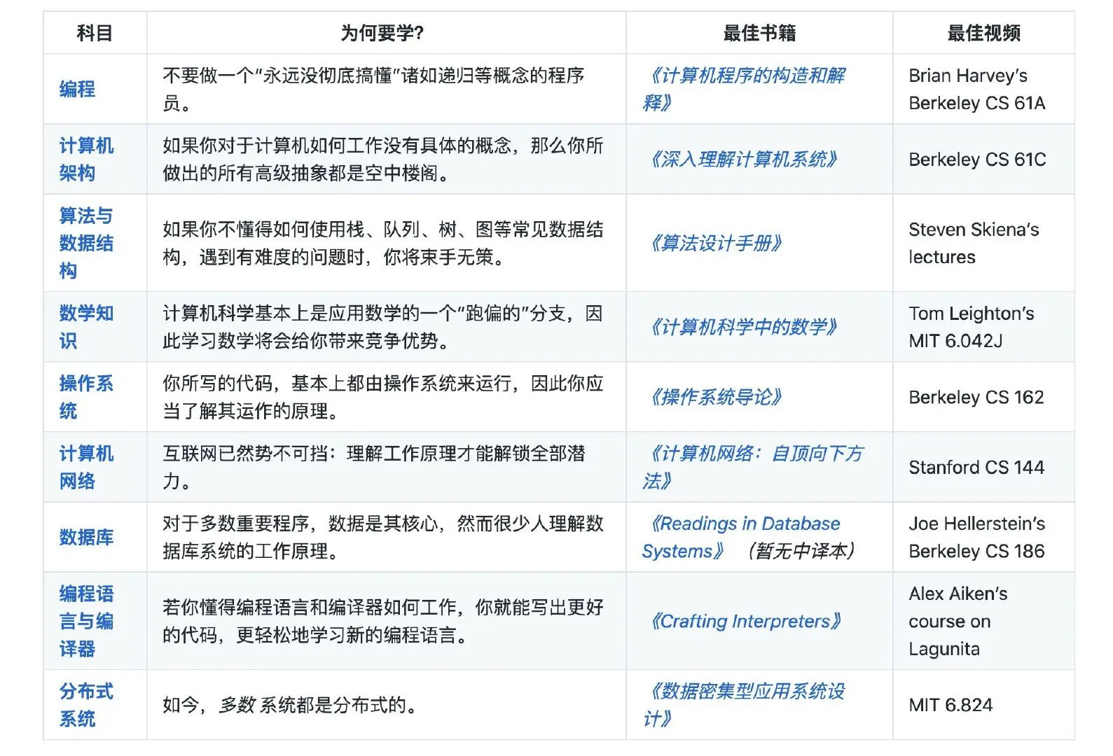 如果花几年时间自学 9 门科目让人望而却步,我们建议你只专注于两本书:《深入理解计算机系统》 和 《数据密集型应用系统设计》。根据我们的经验,投入到这两本书的时间可以获得极高的回报率,特别适合从事网络应用开发的自学工程师。这两本书也可以作为上面表格中其他科目的纲领。