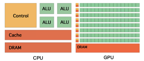 而 GPU 拥有更多的计算单元 Arithmetic Logic Unit,具有更强的计算能力,同时也具有更多的控制单元。GPU 基于大吞吐量而设计,每一部分缓存都连接着一个流处理器(stream processor),更加适合大规模的并行计算。