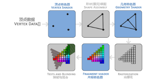 - 形状装配(Shape Assembly):图元中的三角形、线段、点分别对应三个 Vertex、两个 Vertex、一个 Vertex。这个阶段会将 Vertex 连接成相对应的形状。