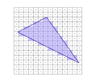 一种简单的划分就是根据中心点,如果像素的中心点在图元内部,那么这个像素就属于这个图元。如上图所示,深蓝色的线就是图元信息所构建出的三角形;而通过是否覆盖中心点,可以遍历出所有属于该图元的所有像素,即浅蓝色部分。