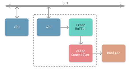 在图像渲染流程结束之后,接下来就需要将得到的像素信息显示在物理屏幕上了。GPU 最后一步渲染结束之后像素信息,被存在帧缓冲器(Framebuffer)中,之后视频控制器(Video Controller)会读取帧缓冲器中的信息,经过数模转换传递给显示器(Monitor),进行显示。完整的流程如下图所示: