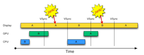 启用 Vsync 信号以及双缓冲机制之后,能够解决屏幕撕裂的问题,但是会引入新的问题:掉帧。如果在接收到 Vsync 之时 CPU 和 GPU 还没有渲染好新的位图,视频控制器就不会去替换 frame buffer 中的位图。这时屏幕就会重新扫描呈现出上一帧一模一样的画面。相当于两个周期显示了同样的画面,这就是所谓掉帧的情况。