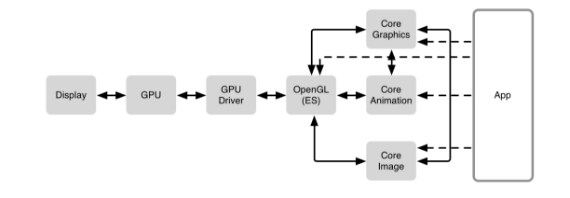 Metal:Metal 类似于 OpenGL ES,也是一套第三方标准,具体实现由苹果实现。Core Animation、Core Image、SceneKit、SpriteKit 等等渲染框架都是构建于 Metal 之上的。