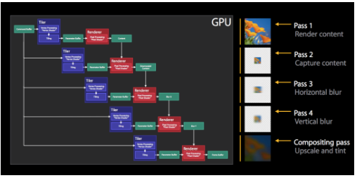 整个模糊过程分为多步:Pass 1 先渲染需要模糊的内容本身,Pass 2 对内容进行缩放,Pass 3 4 分别对上一步内容进行横纵方向的模糊操作,最后一步用模糊后的结果叠加合成,最终实现完整的模糊特效。
