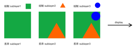 在普通的 layer 绘制中,上层的 sublayer 会覆盖下层的 sublayer,下层 sublayer 绘制完之后就可以抛弃了,从而节约空间提高效率。所有 sublayer 依次绘制完毕之后,整个绘制过程完成,就可以进行后续的呈现了。假设我们需要绘制一个三层的 sublayer,不设置裁剪和圆角,那么整个绘制过程就如下图所示:
