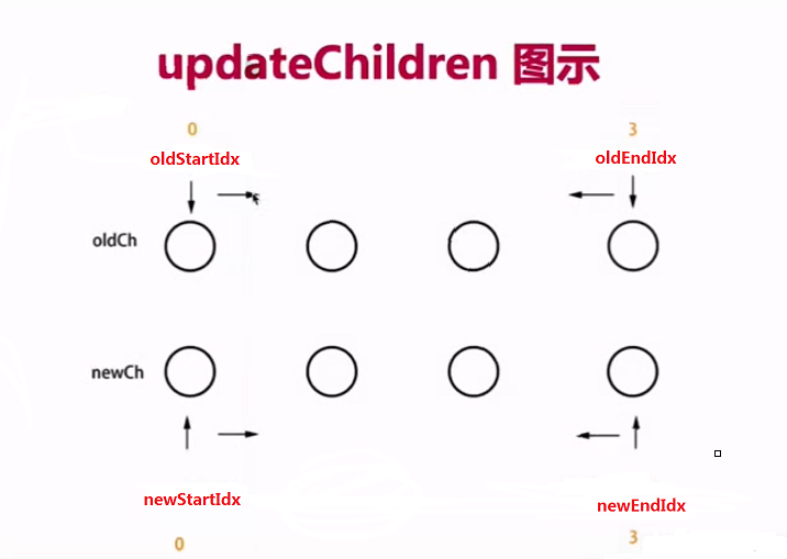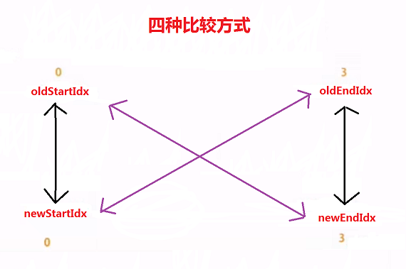 - oldv和newv各有两个头尾的变量StartIdx和EndIdx,它们的2个变量相互比较,一共有4种比较方式,在比较的过程中,变量会往中间靠。