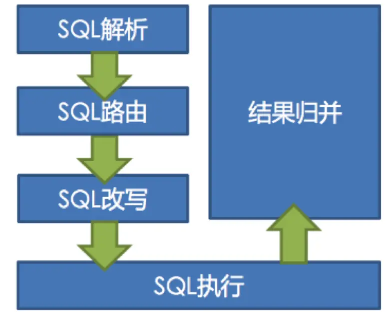 在 ShardingSphere 目前提供的两个产品中,对于数据分片的处理流程是完全一致的。流程包括 SQL 解析、SQL 路由、SQL 改写、SQL 执行、结果归并,如图 2 所示。