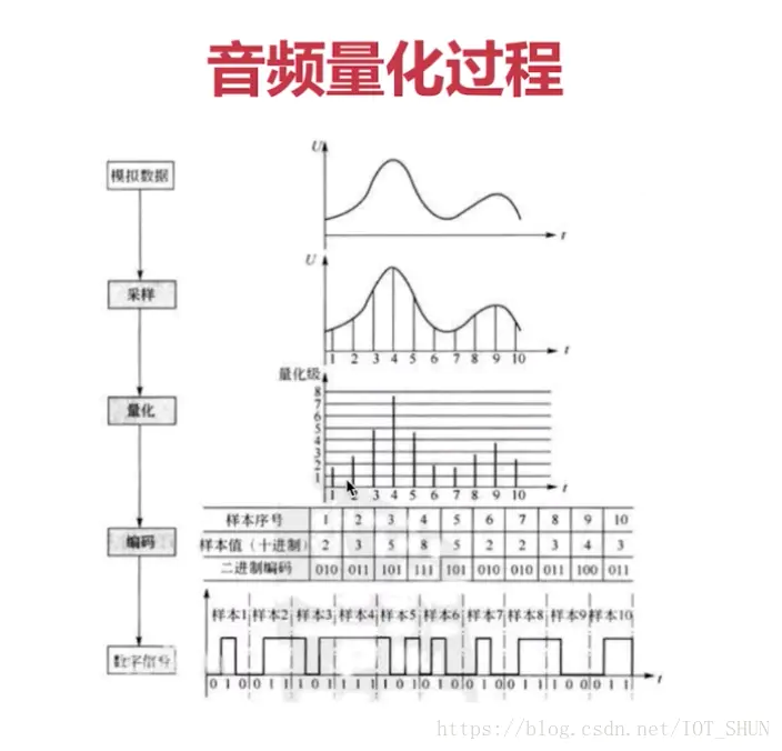 最后就是编码了。由于数字信号是由0,1组成的,因此,需要将幅度值转换为一系列0和1进行存储,也就是编码,最后得到的数据就是数字信号:一串0和1组成的数据。