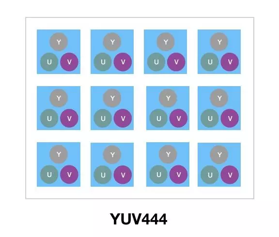 YUV 4:4:4采样,每一个Y对应一组UV分量。