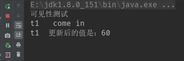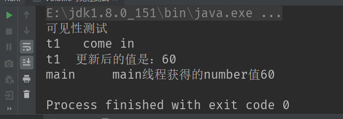 - 测试结果:没有加volatile之前main线程无法立即获得更新后的number值会在while循环阻塞住。加了volatile之后的是第二张图。