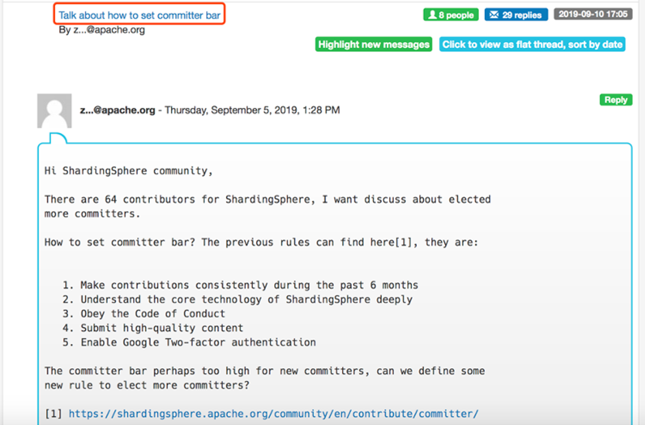 起初,我们并不知道问题出在哪里,迷茫了很长一段时间,直到在跟 Apache 的 member 不断交流的过程中才渐渐意识到问题所在,因此社区发起了有关 committer bar 的讨论,见图 1-2。这是社区建设之路的转折点,因为从此 community over code 的理念开始逐渐渗入人心,并指导我们的行动。