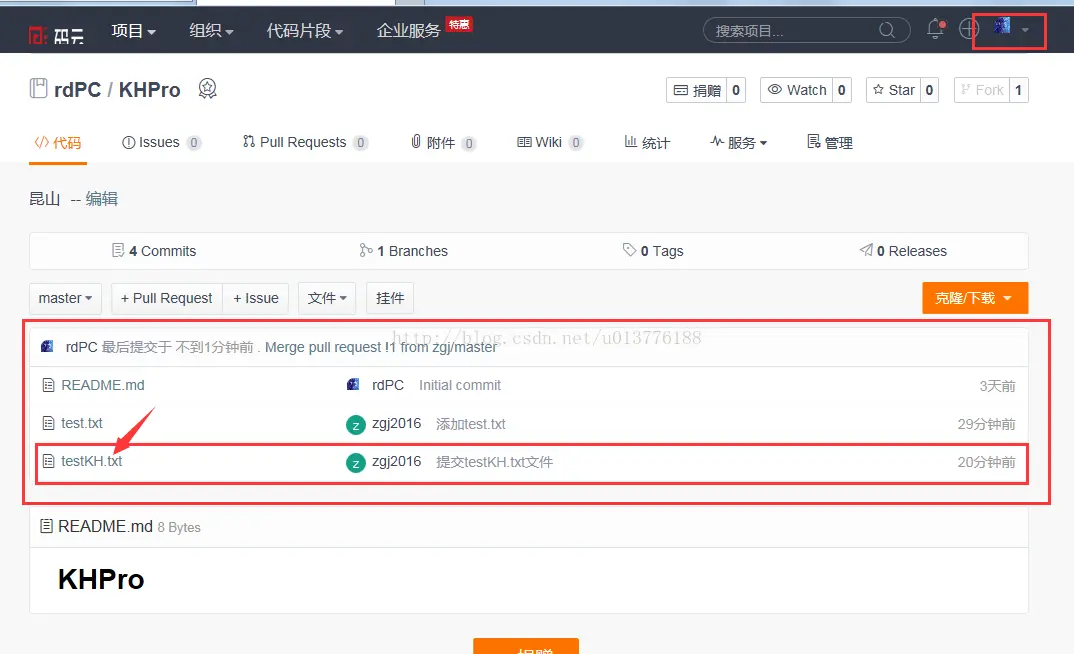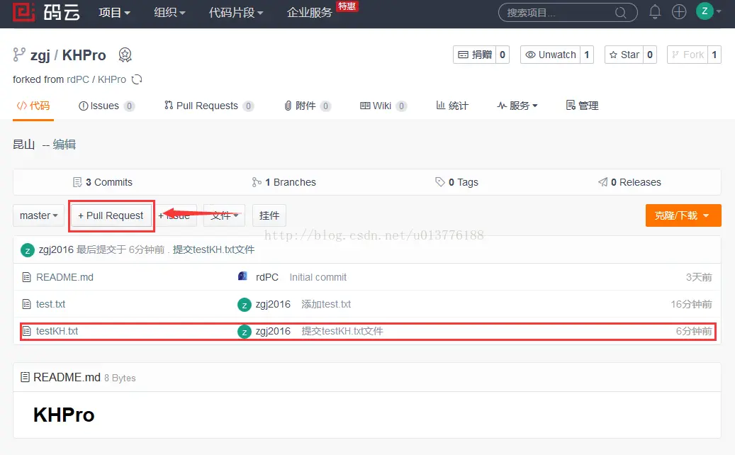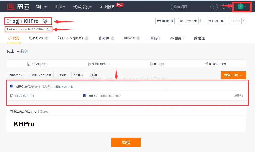 点击rdPC/KHPro 进入管理者项目目录,点击fork,在弹出的对话框中点击“确定”按钮,这样在自己的远端库中就复制了一份管理者创建的项目。