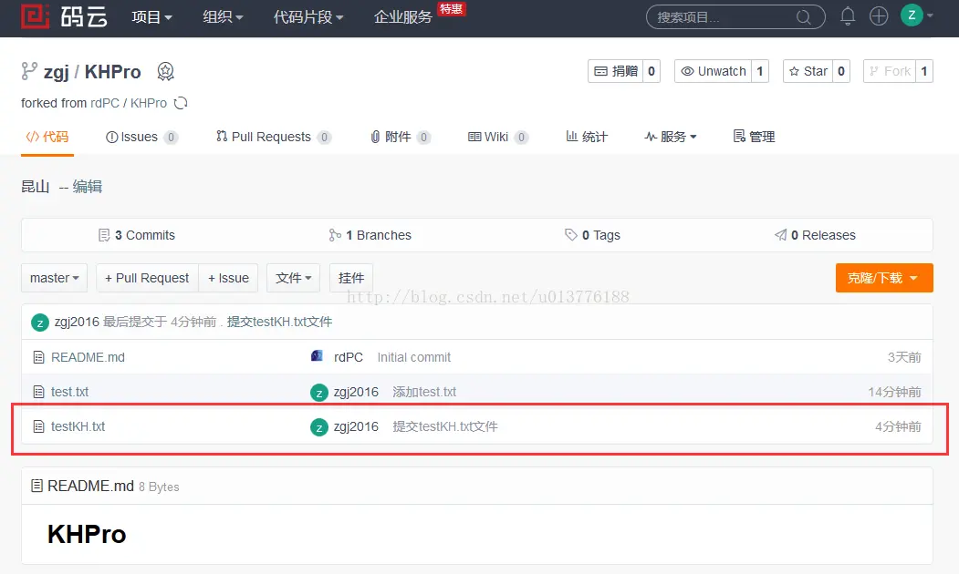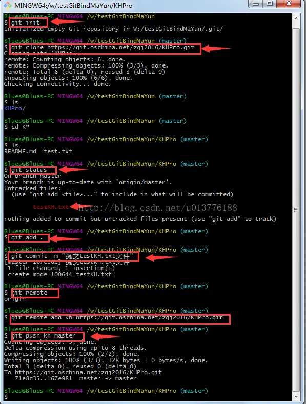-> git remote add kh git.oschina.Net/zgj2016/KHP… (这行命令执行一次就行,是为了给自己仓库的地址起个别名,下次提交不需要执行此行代码)