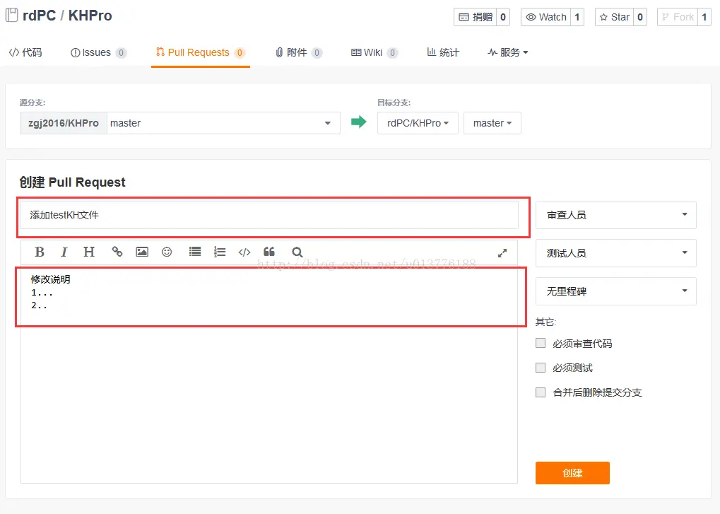 7.下面需要发送请求向管理者合并测试没有问题的代码,完成总的代码的合并。首先pull request,添加修改标题和修改内容,点击创建,完成申请,操作如下: