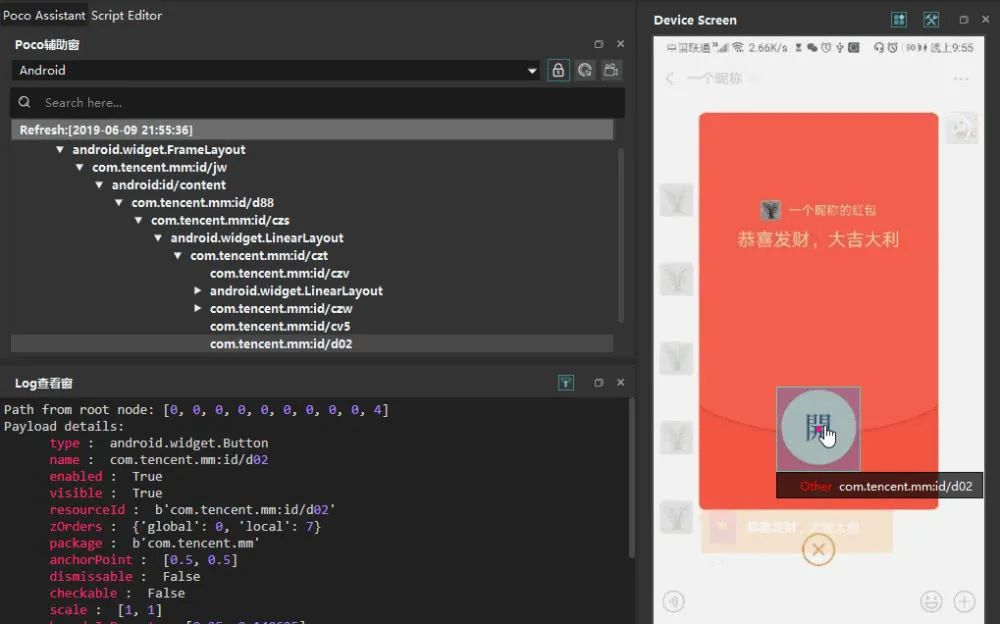 识别微信中的消息,是红包还是普通的信息,这里我们通过聊天消息的元素标识来判断。这里我们借助了「Airtest IDE」工具来实现。
