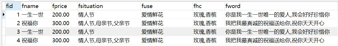 VALUES("一生一世",200,"玫瑰,香槟","爱情鲜花","情人节","你是我一生一世唯一的爱人,我会好好珍惜你"),