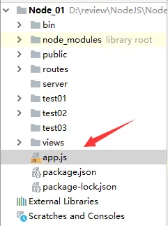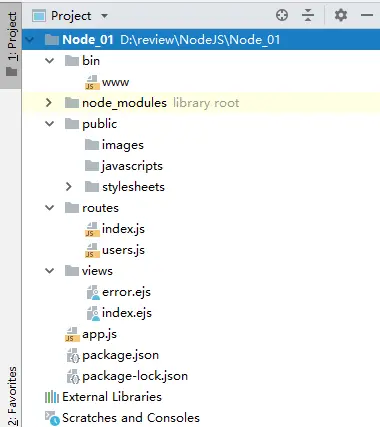 搭建node.js项目的过程我就直接省略了,具体如何搭建node.js项目大家可以自行百度或者后期我会添加相关内容的博客方便大家学习。搭建好的项目结构如下: