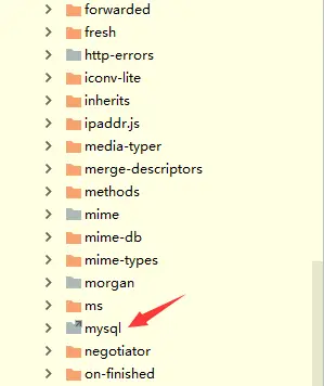 选择任意以上一种方法安装都可以,安装完成之后,我们确认一下是否真的安装成功,找到目录node_modules,这里是查看我们安装的所有依赖,可以看到mysql依赖成功了。