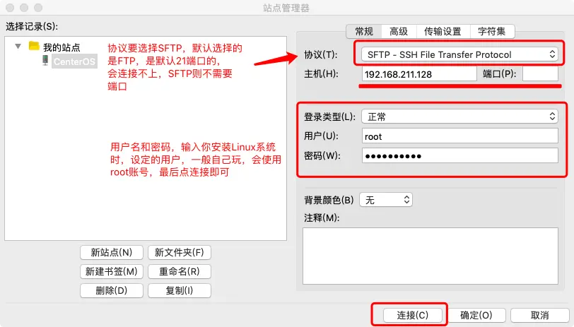 - 新建FTP连接,注意默认选择的协议是FTP连接,我们要使用SFTP,才能连接上,输入登录的账户和密码,连接即可。