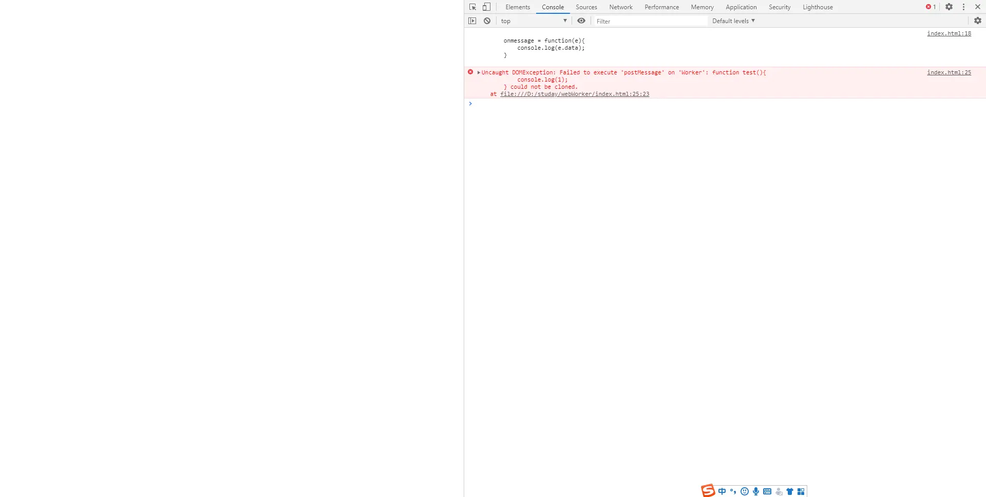 在主线程和worker线程都通过postMessage()来发送消息,通过onmessage来获取消息。这里需要注意的是,通过postMessage发送的数据并不是共享的 而是复制的。Error和Function对象不能够被正确复制,如果你尝试这么做的话,会被浏览器跑出一个Error,就像下面这样: