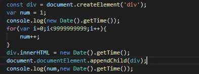 这是一段正常执行的js代码,可以看到,页面在一进来的时候一直在执行循环,页面变为挂起状态,并且阻塞了下面所有脚本的执行,由于这个循环计算,导致下面的代码无法执行,而且从页面打印的几个时间戳也可以很明显的看出来渲染和执行时间。整个执行过程长达149509毫秒,也就意味着用户需要等待149509的白屏