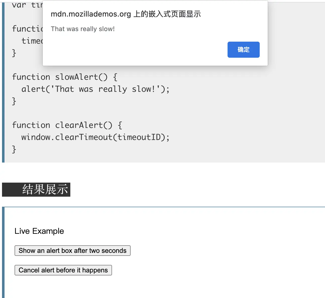 下文的例子在网页中设置了两个简单的按钮,以触发 setTimeout() 和 clearTimeout() 方法:按下第一个按钮会设置一个定时器,定时器在 2s 后显示一个警告对话框,并将此次 setTimeout 的定时器 ID 保存起来,按下第二个按钮可以取消定时器。