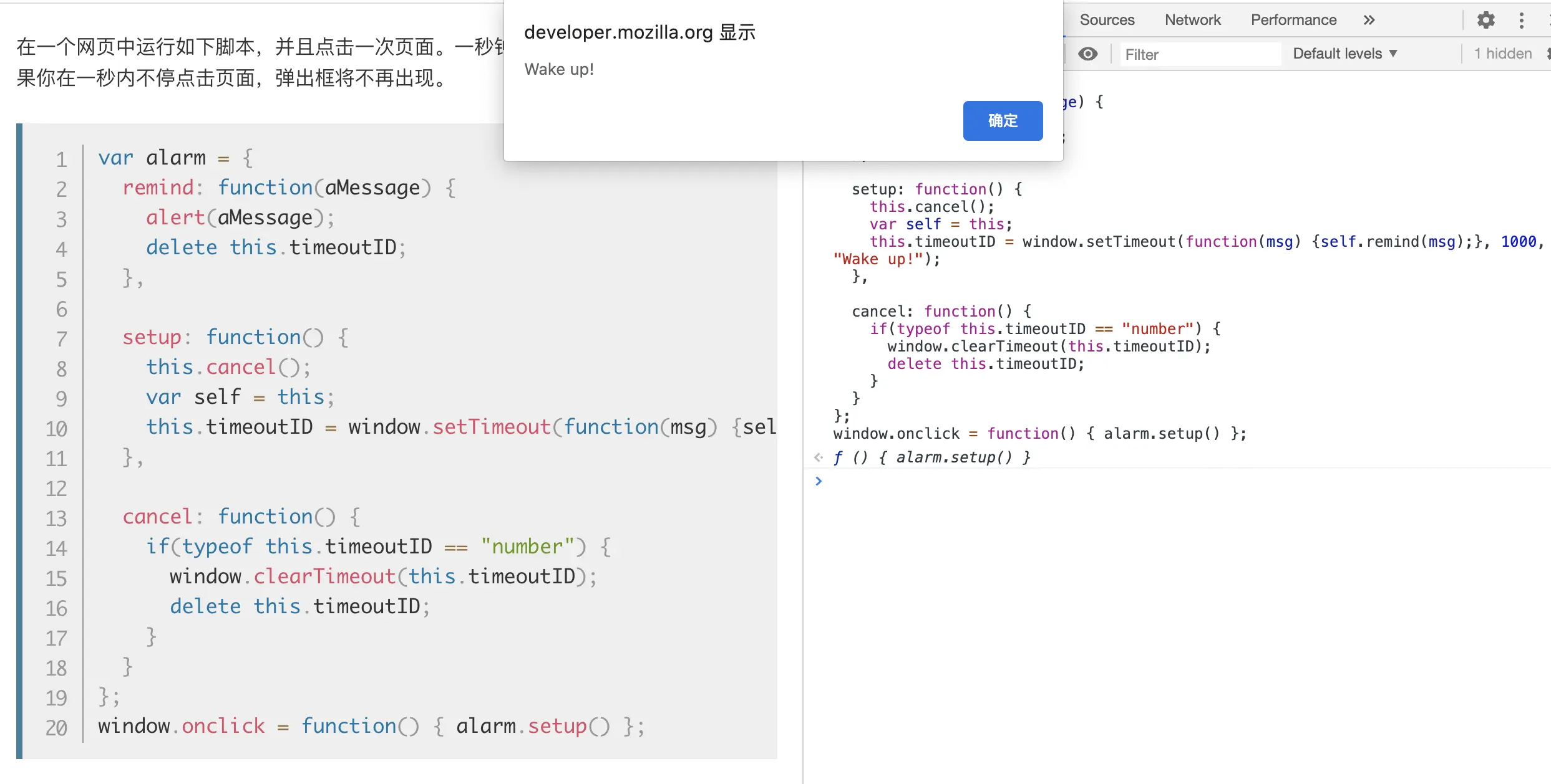 在一个网页中运行如下脚本,并且点击一次页面。一秒钟后你会看见弹出一条信息。如果你在一秒内不停点击页面,弹出框将不再出现。