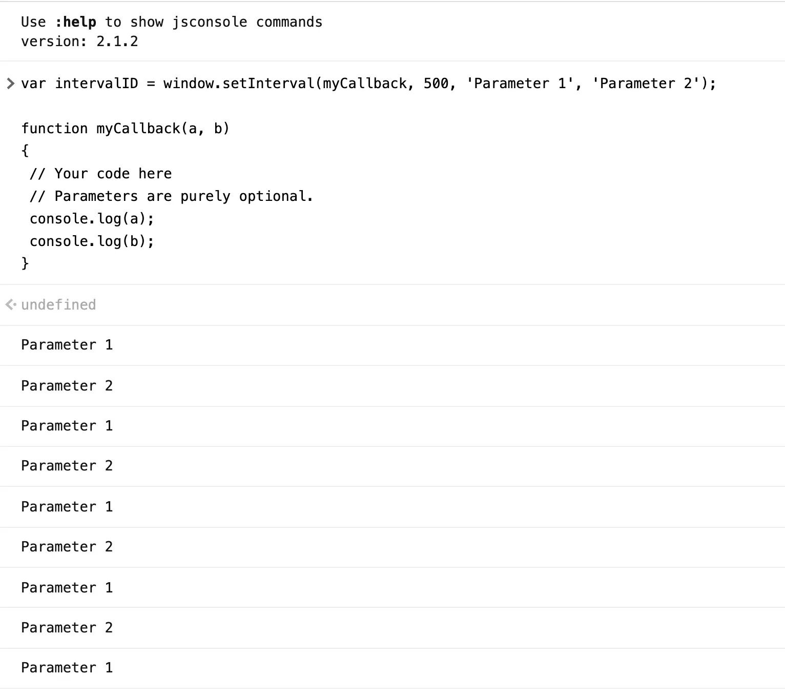 var intervalID = window.setInterval(myCallback, 500, 'Parameter 1', 'Parameter 2');