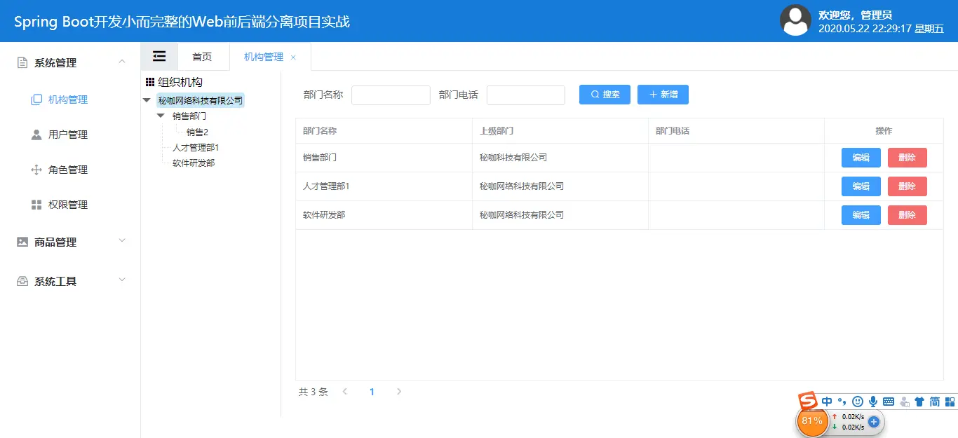课程分前端和后端两部分;前端采用Vue Element 完成界面布局,从零开始搭建前端项目,手把手带领搭建完成从0到1的完成前端项目的开发,数据接口对接,动态菜单的加载,动态路由的生成,token的校验等;后端采用Spring Boot 、Spring Security开发接口,从0开始带领搭建后端项目,权限管理设计开发、Spring Security权限框架在前后端分离项目中的使用等。课程做了详细的笔记文档,方便使用学习。