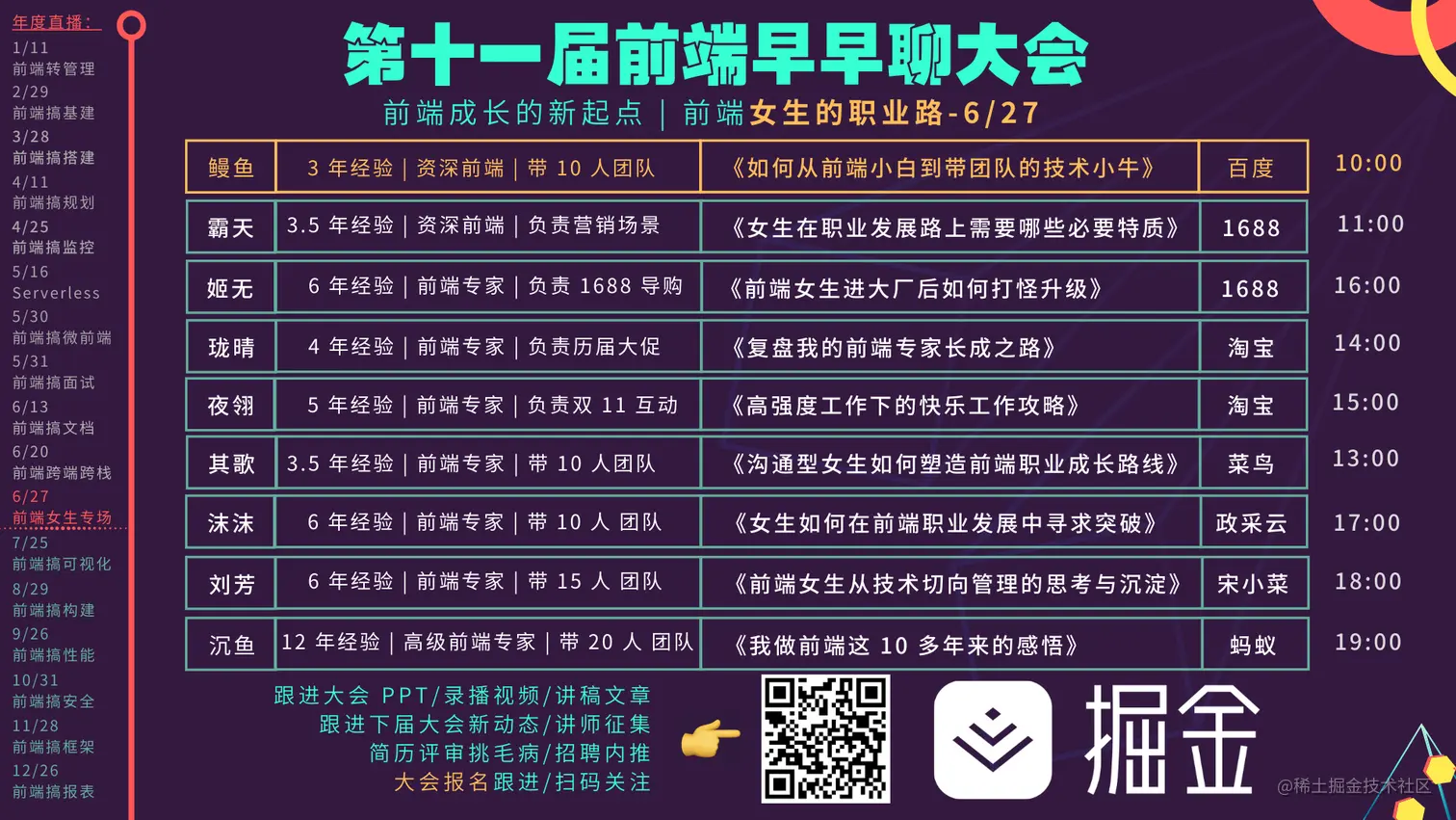- 第十一期 2020.6.27 线上直播,8 位讲师,主题 「前端女性的职业路」,如何更合理的做女生前端自身的进阶规划,报名后请加小助手进直播群:Eva_melon