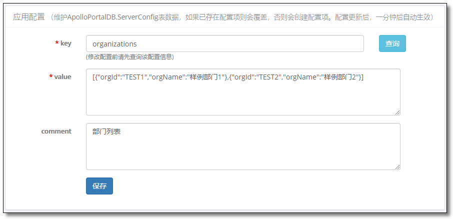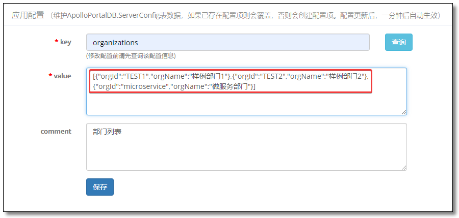 在value一栏中添加自定义部门信息,点击保存,无特殊说明则修改完一分钟实时生效。