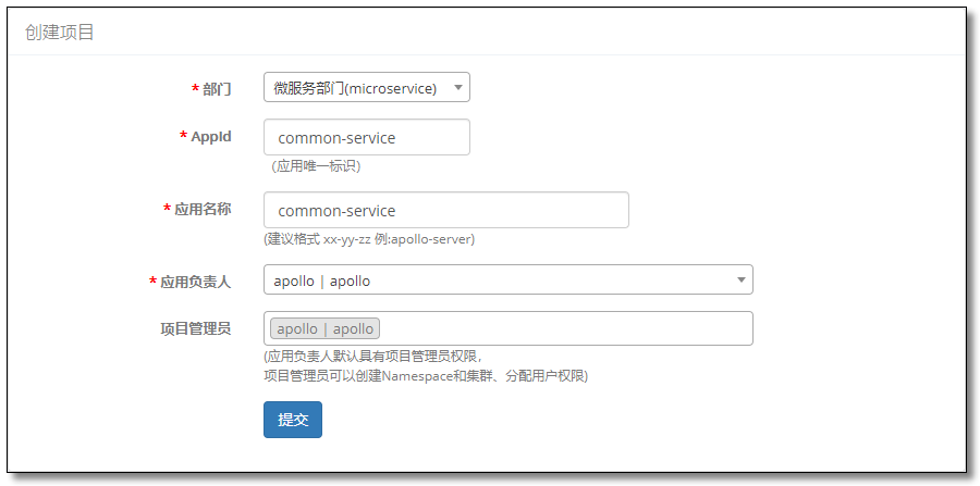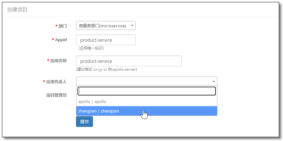 此时再去创建项目时,就可以选择我们刚才添加的用户了。如下图,我们给 product-service 项目分配了负责人 zhangsan,如果使用zhangsan登录的话,则只能看到他自己负责的项目。而 apollo 用户是超级管理员所以可以看到所有项目。